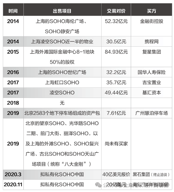 2016年,又将上海SOHO世纪广场卖给国华人寿保险,总价32.2亿元。