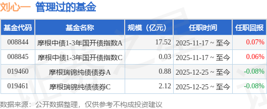 刘心一女士:曾任融通基金管理有限公司固定收益部固定收益研究员;自2024年10月加入摩根基金管理(中国)有限公司(原上投摩根基金管理有限公司),历任基金经理助理,现任债券投资部基金经理。2025年11月17日担任摩根中债1-3年国开行债券指数证券投资基金基金经理。现任摩根瑞锦纯债债券型证券投资基金基金经理。