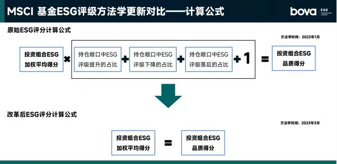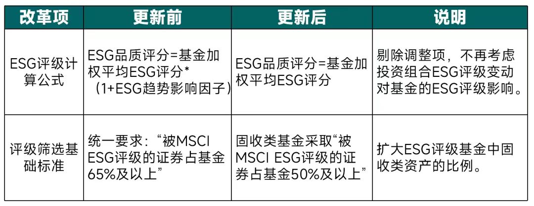 以评级方法学公式为例,如图2所示,原始ESG评级方法学公式综合考虑ESG加权评分与调整项,鼓励基金经理在筛选ESG表现良好的投资标的同时,兼顾具有ESG评级成长性的标的,以鼓励资本向积极改善ESG表现的企业倾斜。然而,此次方法学改革将标准提高,剔除ESG趋势影响因子,要求基金经理只能筛选ESG表现优良的投资标的,以保证自身基金的ESG评级。