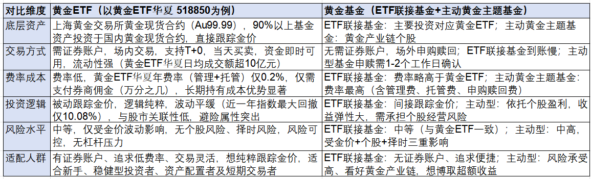 黄金ETF和黄金基金的选择,核心是“匹配自身需求”:黄金ETF(如黄金ETF华夏 518850)胜在低费率、交易灵活、逻辑纯粹,适配大多数普通投资者;黄金基金(ETF联接+主动型)胜在便捷性或收益弹性,适配不同场景的个性化需求。
