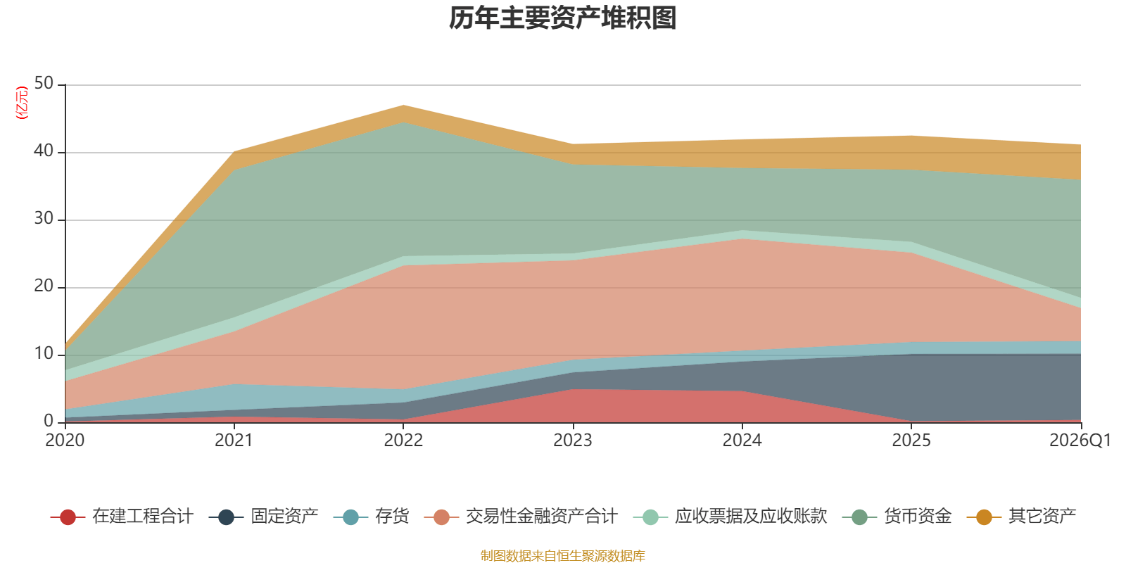 资产重大变化方面,截至2026年一季度末,公司交易性金融资产合计较上年末减少63.15%,占公司总资产比重下降19.35个百分点;货币资金较上年末增加63.78%,占公司总资产比重上升17.38个百分点;固定资产较上年末减少1.07%,占公司总资产比重上升0.5个百分点;其他流动资产较上年末增加18.23%,占公司总资产比重上升0.44个百分点。